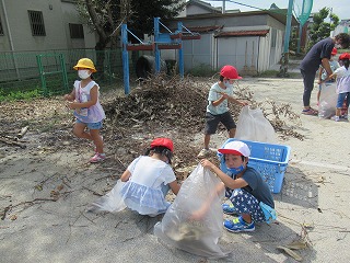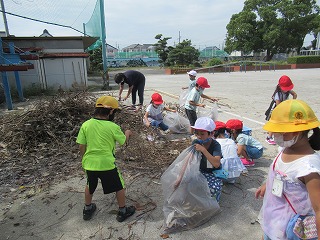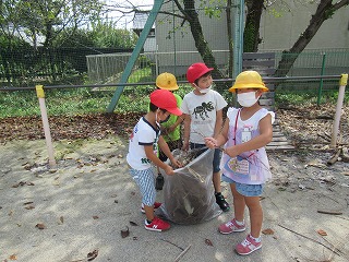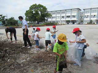1年生の子どもたちが、校務先生のお手伝いをして、枝を袋につめこんでいました。みんな一生懸命がんばり、働いてくれています。感心ですね。