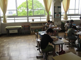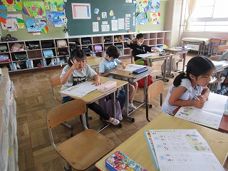 2年1組では、書写の時間、ノートを書いていました。できた子から先生に見てもらうため、並んでいました。