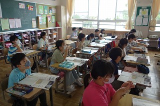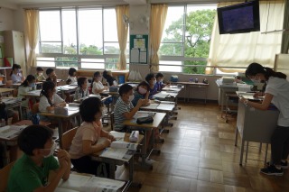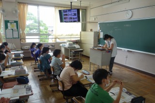 4年1組の社会は、水害を防ぐ施設について学びました。具体的な施設の資料を、モニター画面で確認しました。