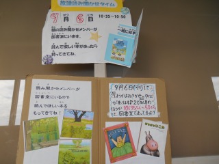 9月の放課読み聞かせは、今週9月6日(水)の2限休み時間となります。ボランティアの方が作ってくださったお知らせを、図書室に掲示させていただきました。