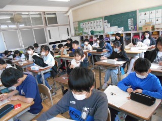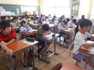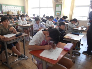 アルファベットの大文字と小文字のテストをしていました。小文字が難しいようですが、がんばって思い出しながら書いていました。