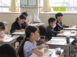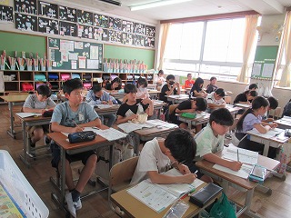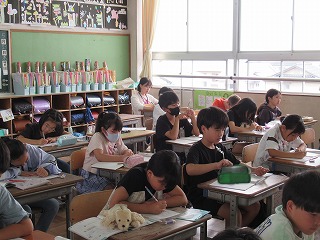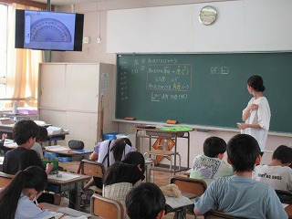 4年2組は算数の時間でした。角度の単元に入り、分度器などを用いて角度を測る学習などを行っていました。