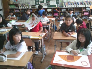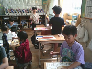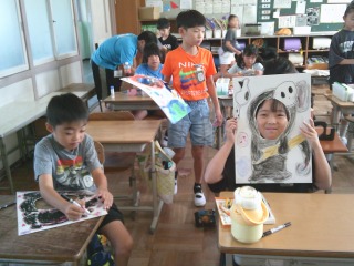 顔抜きのできる絵がほぼ完成していました。自分の顔を何から飛び出させるのか考え、顔を絵から出しながら見せてくれました。
