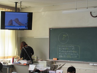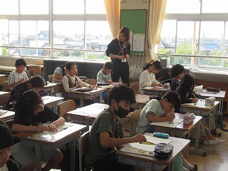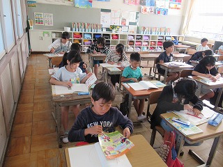 3年2組は算数の時間でした。コンパスを使って、円を描き、半径という用語を覚えていました。コンパスを使う作業は、みんな楽しそうです。