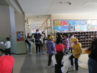 昼休みが終わり、掃除へ向かおうと子どもたちが校舎へ戻ってきたところです。保健委員の皆さんが、安全に移動できるように保健委員会が今週呼びかけています。