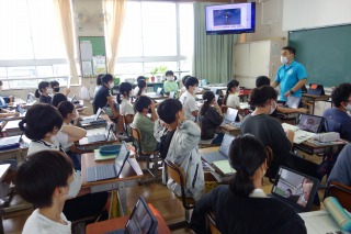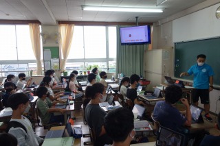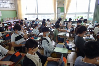 6年1組の外国語は、タブレットを使って行われました。ひとりひとりがタブレットを使い、動画を活用して学習を進めました。