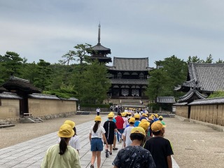 6年生は、最後の見学地、法隆寺に到着しました。学年で集合写真を撮りました。