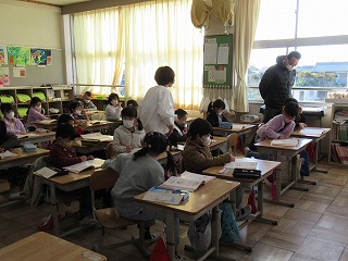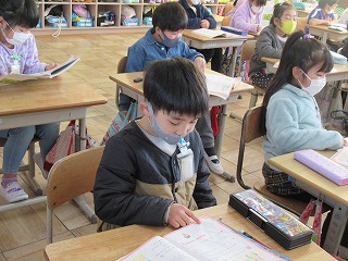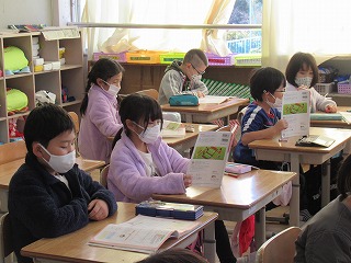1年2組では、算数の授業が行われていました。教科書の問題を確認しながら、授業が進められていました。
