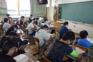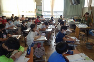 6年2組の理科は、地層の学習でした。水のはたらきによって、地層がどのようにできるのかを、演示実験を交えて考えました。