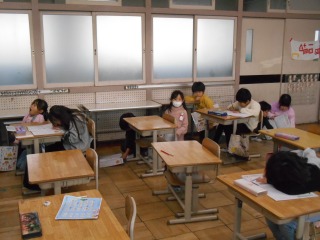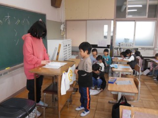 カタカナの練習をし、できた子から並び、先生が確認をしているところでした。