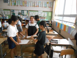 しつもんじゃんけんに取り組んでいました。相手をどんどんとかえ、行きたいところなどを質問し答えていました。