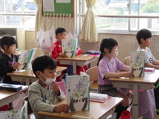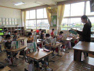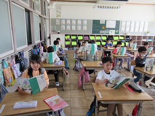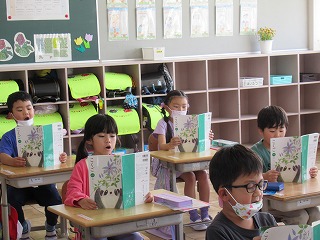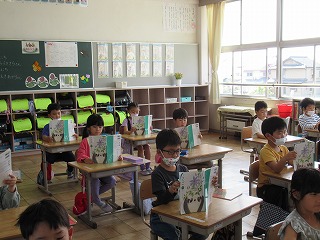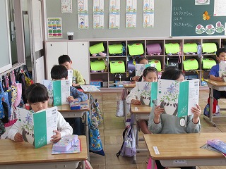 1年2組では、国語の時間、音読を行っていました。先生の後に続いて、声を合わせて読んでいきます。とっても上手に読めたので、校長先生からはなまるをもらいました。