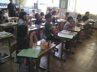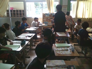ALTの先生と"What ~ do you like?"を使った会話のやり取りをしていました。一人一人回りながら、先生と英会話です。