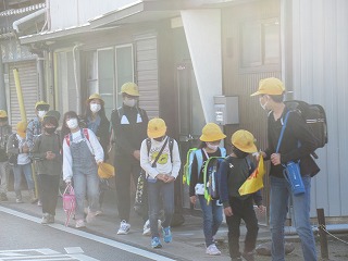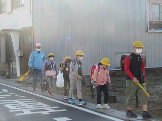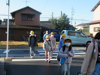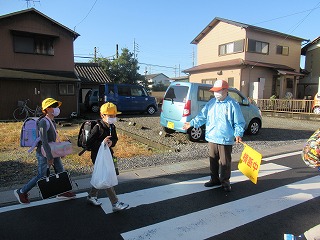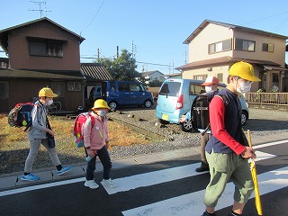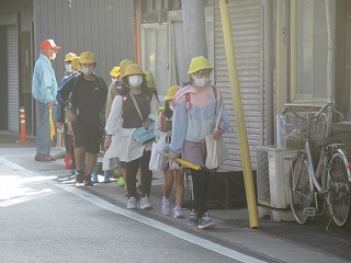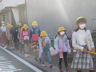 南門の通学団の登校のようすです。今日は、お日様が当たって、少し温かく感じます。