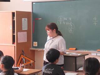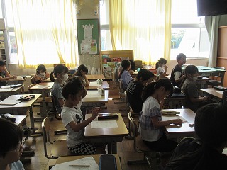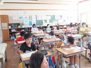 4年1組では、音楽のテストが返却され、答えの確認をしていました。