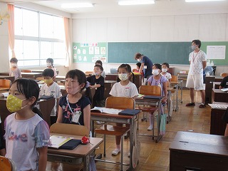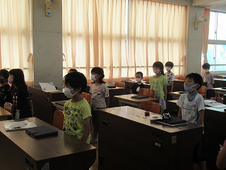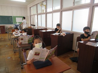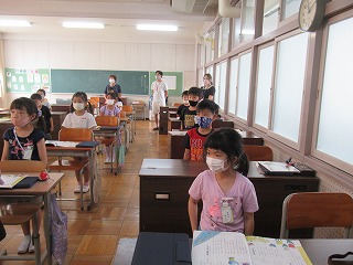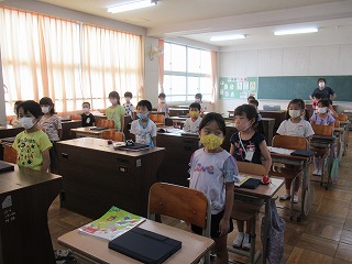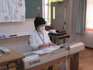 1年1組では、音楽の授業が行われていました。校長先生に校歌を聴いてもらおうということになり、校歌を披露してくれました。本当に、大きな声でしっかりと、上手に校歌が歌えました。校長先生からは、はなまる100個!とほめられました。