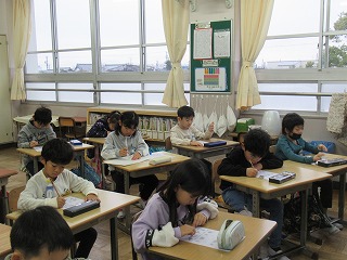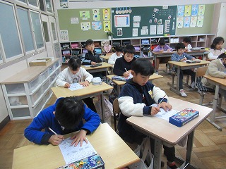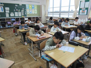 2年1組では、朝学習の時間、真剣に問題に取り組んでいました。