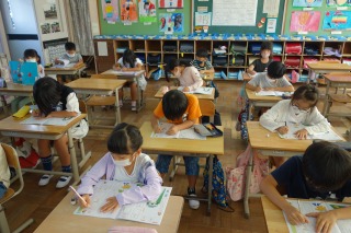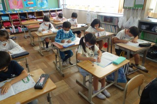 2年2組の書写は、書き方のノートを書きました。姿勢に気をつけて、丁寧な字を書きました。