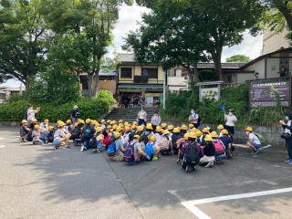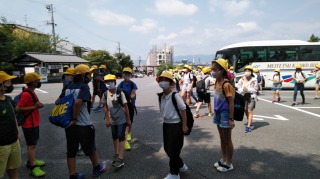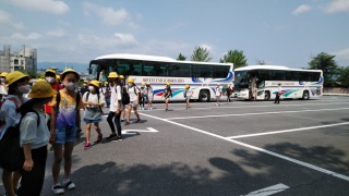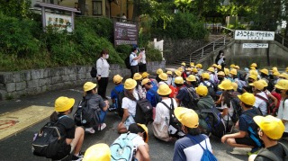 6年生は、清水寺に到着しました。天気も良いようです。6年生はバスを降り、先生方の話を聞いています。