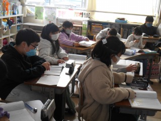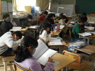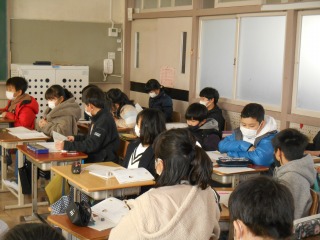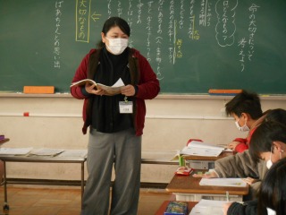 いのちについて考えていました。「おばあちゃんが心の中で生きるとはどういうことか」について考えていました。コの字型の座席で表情をお互い見ながら考えています。