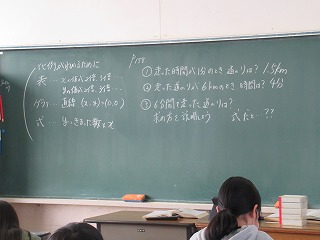 6年2組は算数の時間でした。比例の問題を、表やグラフ・式で表すそれぞれのよさや使い分けの方法を学んでいました。この学習は、中学校の関数につながる学習なので、しっかり理解してほしいと思います。