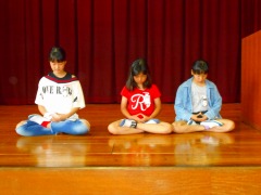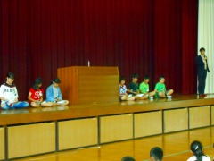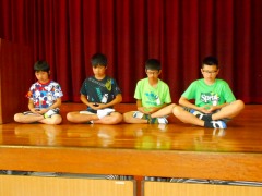 今朝の朝礼の中で、修学旅行で行った座禅が紹介されました。代表の児童に、舞台上でやって見せてもらいました。