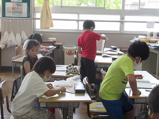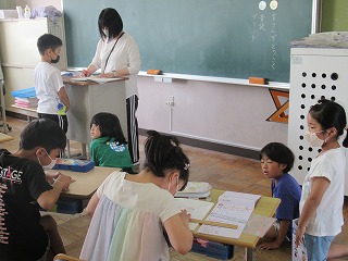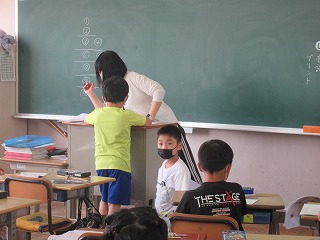 2年1組は算数の時間であした。計算ドリルが解けた人から、先生にみてもらうために、列を作って並んでいました。