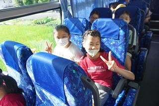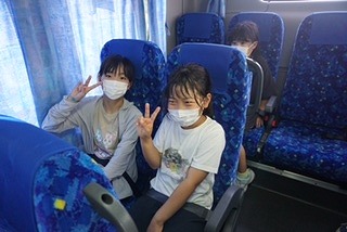 5年生の野外活動のバスの中のようすです。笑顔がはじけていますね。