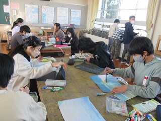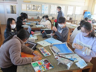 5年2組は図工の時間でした。お気に入りの空の様子を画面で確認しながら、青空や夕焼けの絵を描いていました。