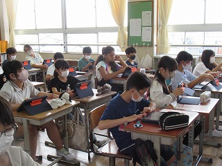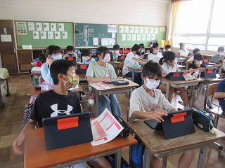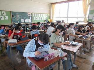 6年2組では、先日行われた体力テストの結果をタブレットに入力しているところでした。