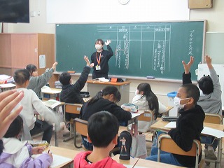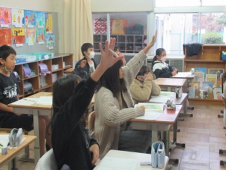 4年2年は国語の時間でした。教科書の登場人物の気持ちを自分ならどう考えるかを発表する場面で、たくさんの手が挙がっていました。