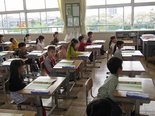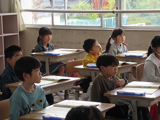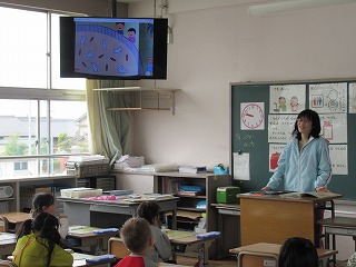 1年1組は国語の時間でした。教科書のページをモニターに映して、みんなで確認しながら、授業を進めていました。