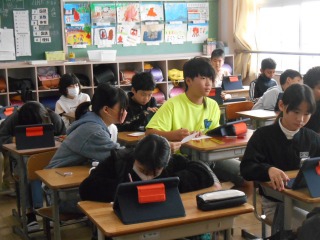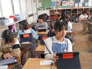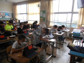 こちらのクラスもお礼状を作成していました。タブレットでまずは下書きをし、お礼のカードへ手書きで手紙を書いていました。