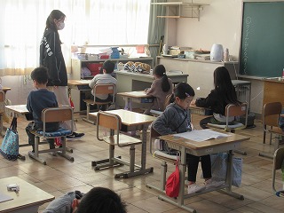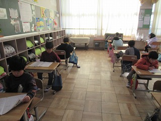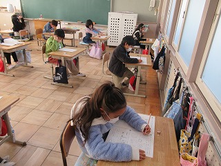 1年2組はテストに取り組んでいました。小学生になって初めて冊子型のテストに挑戦していました。自分の力が発揮できるように頑張ってくださいね。