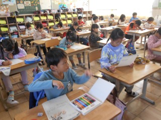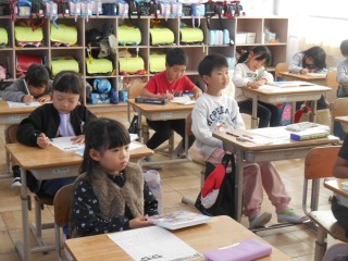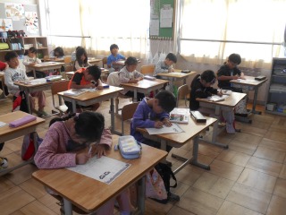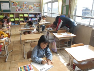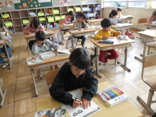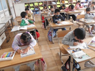 1・2年生が「おもちゃ祭り」を行いました。2年生が作ったおもちゃで、1年生が遊ばせてもらいました。工夫されていたところ、2年生になったら、どんなことに気をつけて次の1年生に楽しんでもらえるかを考えながら、ワークシートに書きこんでいました。