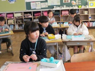 直方体を具体的にイメージするため、粘土と竹ひごで作っていました。