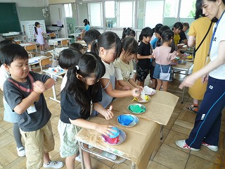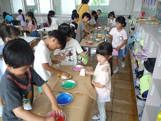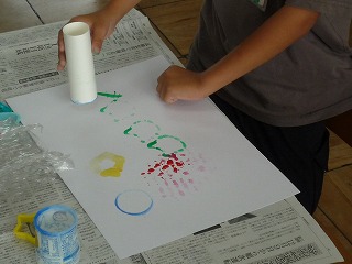 トイレットペーパーの芯や洗たくばさみなどいろいろなものを絵の具につけて、画用紙の上に形を写したり、転がしたりしました。