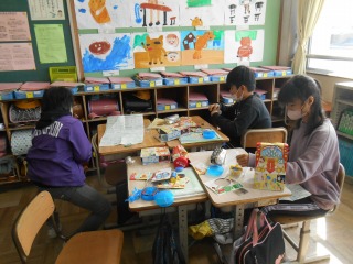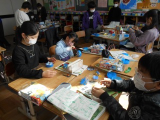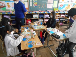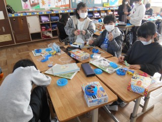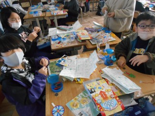 磁石を使ってルーレットや飛ぶちょうちょを作っていました。磁石の不思議に感動していました。
