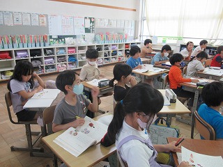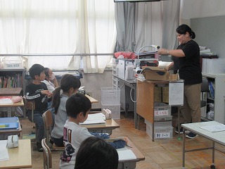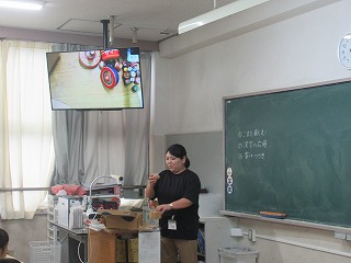 3年1組は国語の時間でした。小木先生が教科書に載っているこまを、実際に用意して、みんなに披露していました。こまといってもたくさんの種類があるものですね。