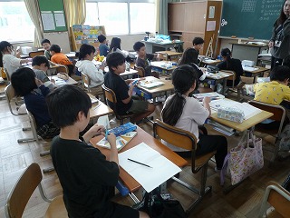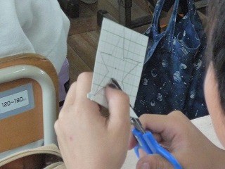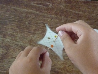 こまをつくって、表面に書いた点が回すとどんな形に見えるか学習しました。