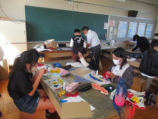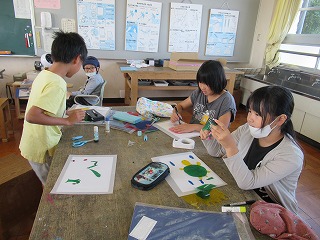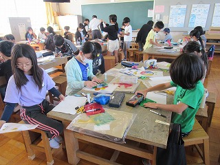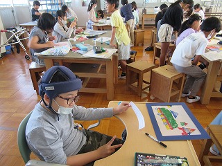 4年1組は図工の時間でした。さまざまな模様を生かして、花や電車などのすきな形を作っていました。