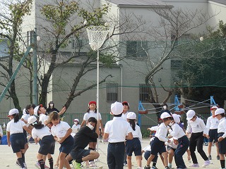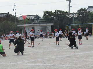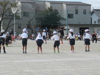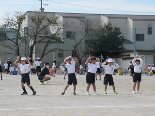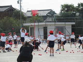 チェッコリ玉入れに取り組んだ2年生。おしりをふってかわいく踊り、玉入れをしていきます。接戦で赤組が勝利しました。