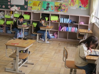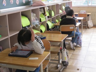 時計の読み方を学習していました。終わった子は、タブレットを使ってドリル学習に取り組んでいました。