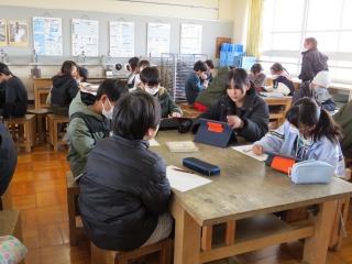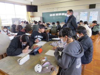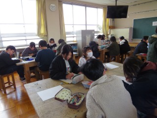 身の回りの物に、その名前を入れ込んだイラストを描きます。何を描くかを決め、まずは図案を考えているところでした。
