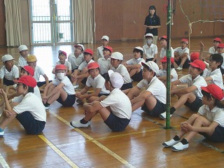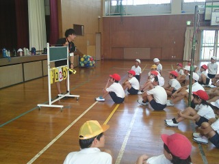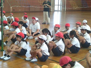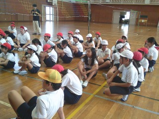 今日はバレーボールをしていました。グループに分かれてウォーミングアップを行った後、審判の仕方について、大切なことを確認しているところでした。