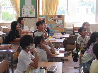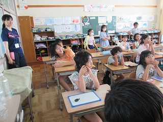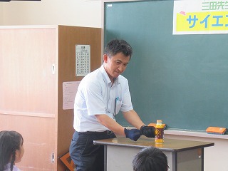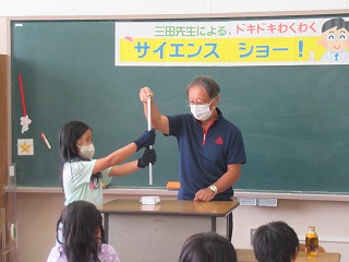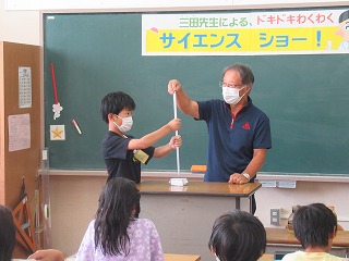 4年1組でも三田先生によるサイエンスショーを行っていただきました。4年生では、教頭先生がスペシャルゲストとして、お手伝いをしました。子どもたちからは、「おー」「すごい」という感嘆の声が上がっていました。三田先生、ありがとうございます。