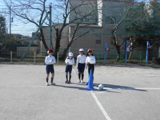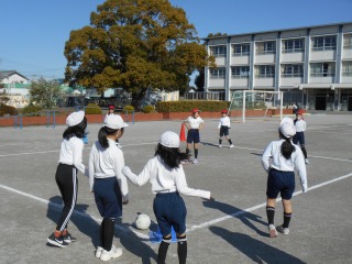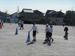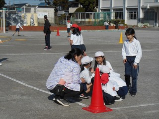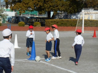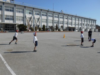 キックベースのような競技をしていました。ルールを確認し、みんなで準備をしているところでした。