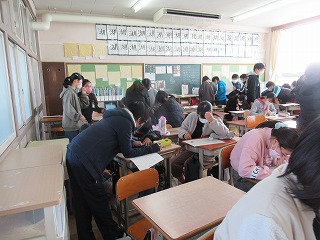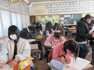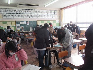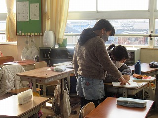 6年1組では、算数のまとめのプリントに取り組み、友達どうしやり方を確認しているところでした。