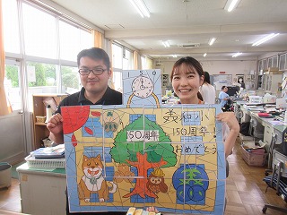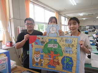 児童会主催の150周年記念パズルが、完成しました。児童会担当の先生方もうれしそうでした。