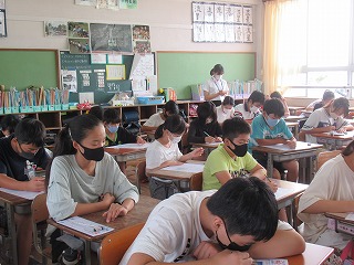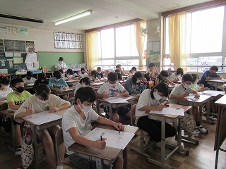 6年2組では、算数の比のテストが行われていました。みんなしっかり問題に取り組み、がんばっていました。
